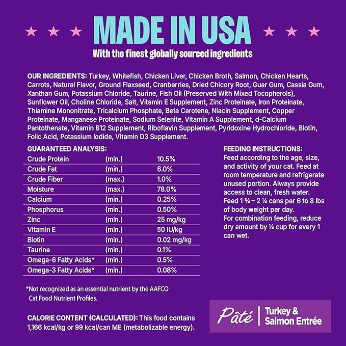- TURKEY & SALMON ENTREE: This natural food for adult cats is an excellent source of high quality proteins, packed with vitamins, minerals, and essential fatty acids for complete, balanced nutrition. Pate is completely smooth for an irresistible taste your cat will love.
