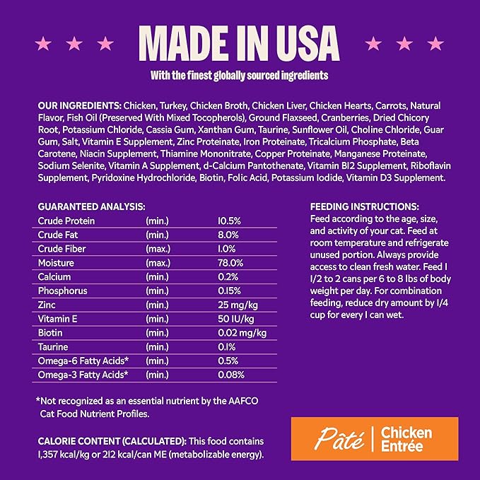 - CHICKEN ENTREE: This natural food for adult cats is an excellent source of high quality proteins, packed with vitamins, minerals, and essential fatty acids for complete, balanced nutrition. Pate is completely smooth for an irresistible taste your cat will love.