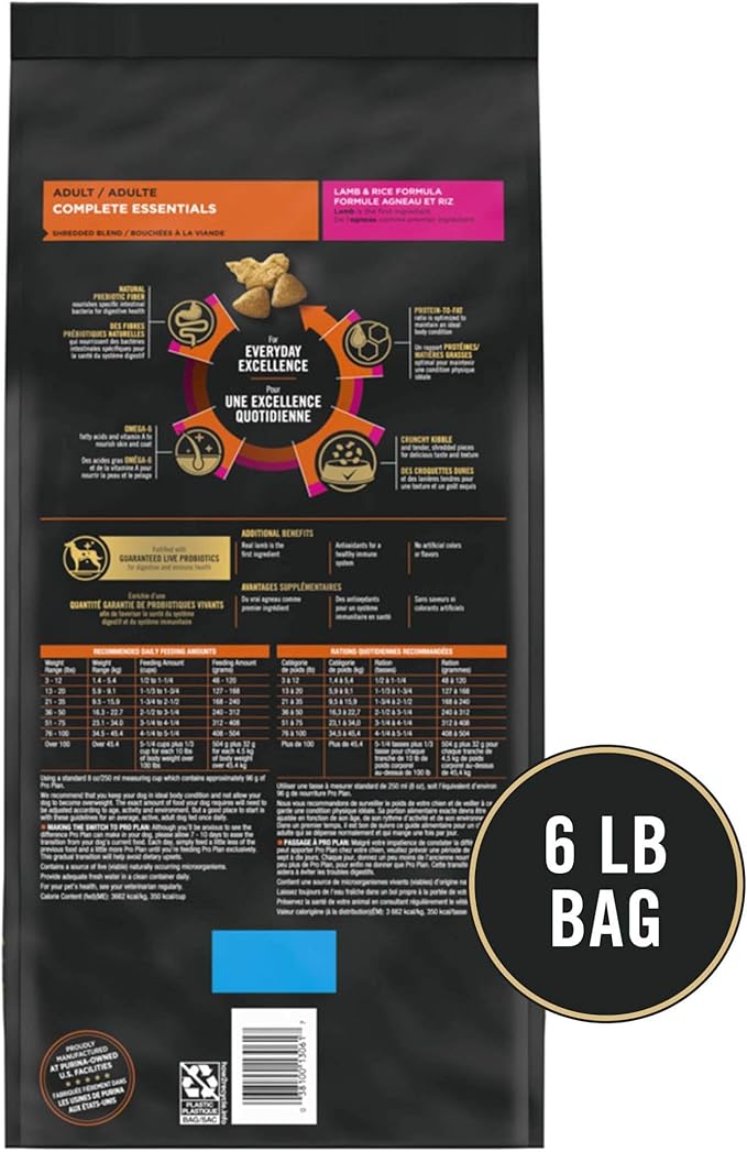 - One (1) 6 lb. Bag - Purina Pro Plan High Protein Dog Food With Probiotics for Dogs, Shredded Blend Lamb & Rice Formula