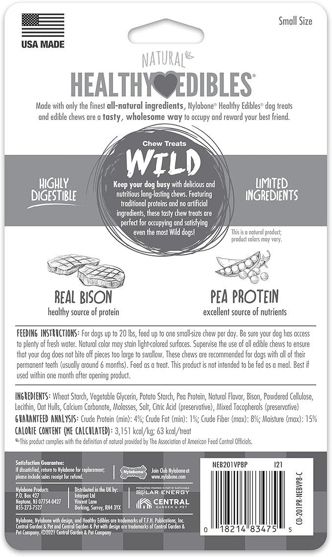 Nylabone Healthy Edibles WILD Natural Dog Chew Treats, Bison Flavor, Small Dogs Up to 20 lbs - Long Lasting Healthy Chew Bones Made in USA (8 Count)