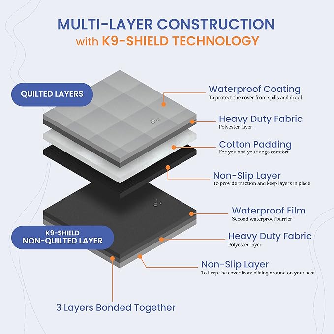 - ADVANCED WATERPROOF PROTECTION: Featuring exclusive K9-Shield waterproof technology, this dog hammock for trucks and large SUVs protects your car from spills, dirt, and drool. The non-slip backing keeps the cover securely in place, even with active pets. Please note that the seams are not watertight, but it provides reliable protection.