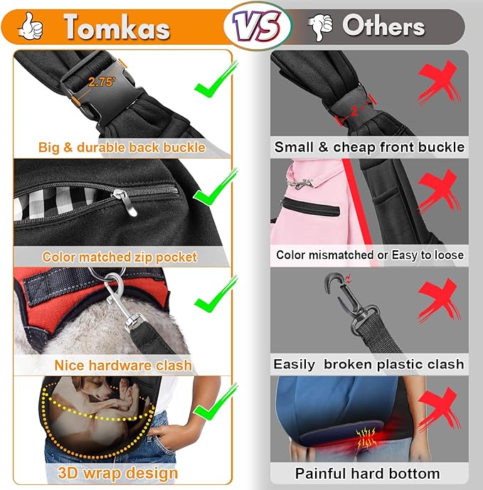 - Sufficient Safety: Your pet's safety is our top priority. The TOMKAS small dog carrier sling has a secure safety buckle that keeps your dog safe and in place. Our carrier provides reliable safety and comfort that you and your pet will love. Remember to never tie the safety buckle to the collar, as it could hurt your dog's neck if it attempts to jump out.
