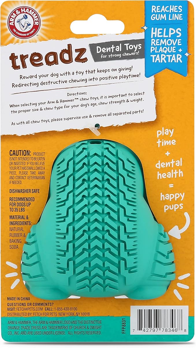- DOUBLES AS A DENTAL TOY FOR DOGS - This durable dog's toy's tire-like treads help remove tartar and plaque build up in your dog's teeth, maintaining a clean mouth and proper dental hygiene for your pup. Plus, it's infused with Arm & Hammer Baking Soda