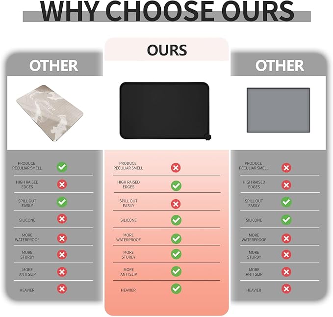 - Various sizes available: our pet mats come in 5 different sizes - 18.5" x 11.5", 22" x 14", 24" x 16", 28" x 18", and 32" x 24". Suitable for all kinds of pets, from puppies to large pets, choose the perfect size for your furry friends and avoid messy spills at mealtime