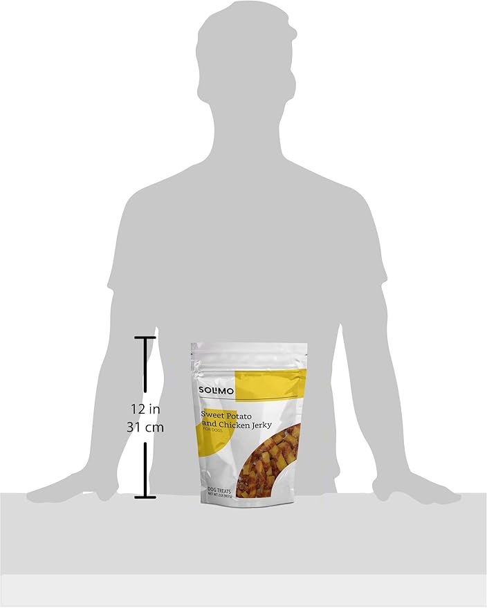 - Includes one 2 lb bag of Solimo sweet potato and chicken jerky dog treats