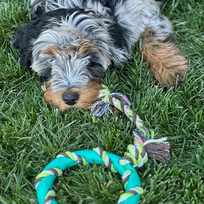 - 6 PACK TOY ASSORTMENT FOR MAXIMUM FUN: Featuring all-natural rubber and cotton toys, a rope toy and a ball with a bell, these safe and non-toxic dog teething toys maximize playtime for your pup!