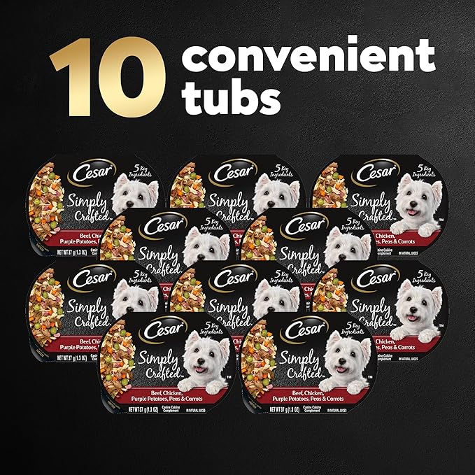 Cesar Simply Crafted Adult Wet Dog Food Meal Topper, Beef, Chicken, Purple Potatoes, Peas & Carrots, 1.3oz. (10 Count, Pack of 1)