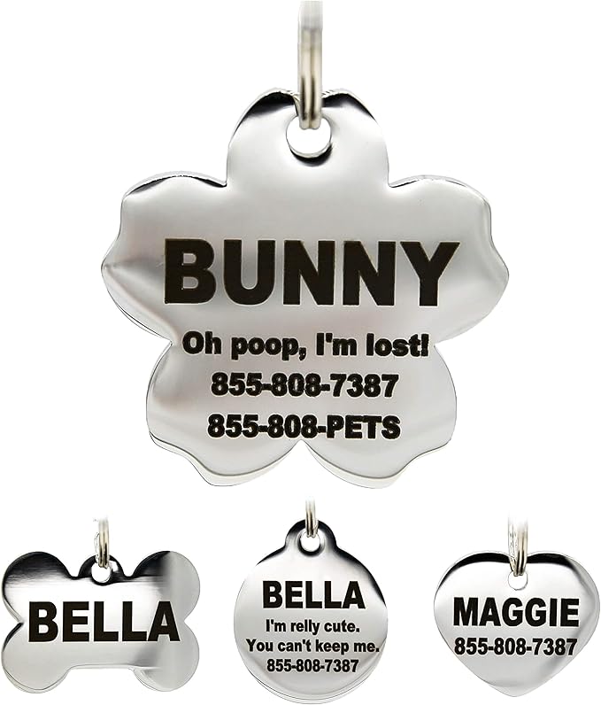 Stainless Steel Pet ID Tags - Engraved Personalized Dog Tags, Cat Tags Front & Back up to 8 Lines of Text – Bone, Round, Heart, Flower, Badge, House, Star, Rectangle, Bow Tie