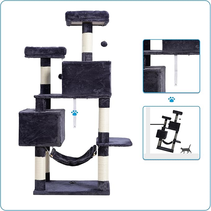 - 【MULTIFUNCTIONAL SPECIAL DESIGN】 Step-like jump multi-layer structure design of cat tower, convenient for cat's scratching, climbing, sleeping, and exercising; 2 roomy condos and 1 sturdy hammock offer luxurious napping experience for more cats use; interactive jingly balls and sisal twine to play with.