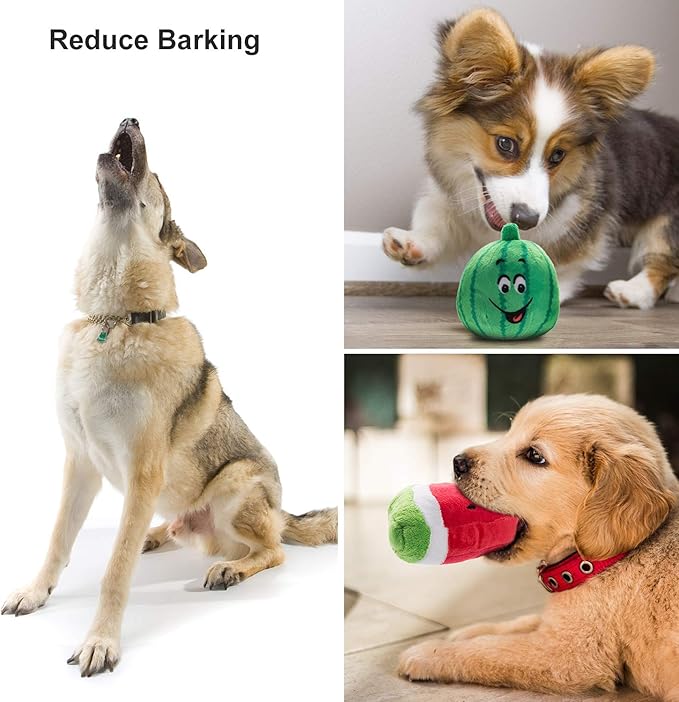 - LOVELY SQUEAKY PLUSH TOYS-12 Pack-Includes watermelon(sphere, slice) Ice cream, star, banana, lobster, apple, chicken leg, orange, triangle watermelon, flip flop, pumpkin, carrot in cartoon figures. Their bright color and cute shapes are the dog's favorites.