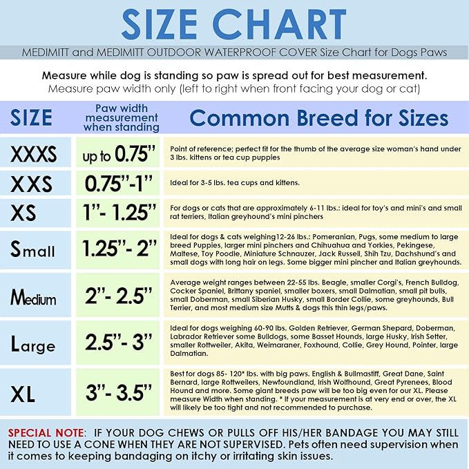 - Size MEDIUM - paw width measurement when standing: between 2-2.50”. Average weight ranges between 20-45 lbs. Beagle, smaller Corgi’s, French Bulldog, Boston terrier Cocker Spaniel, Brittany spaniel, small pit bulls, small Border Collie, , and most medium size dogs with thin legs/paws. IF YOUR DOG CHEWS OR PULLS OFF HIS/HER BANDAGE YOU MAY STILL NEED TO USE A CONE WHEN THEY ARE NOT SUPERVISED.