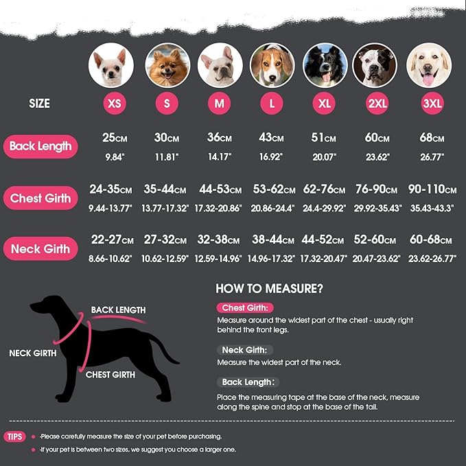 - SIZE INQUIRY: If you don't make sure which size to choose, you can measure your dog firstly then contact us for a recommended size. We are pleased to help you to choose a suitable dog coat for your furry friend.