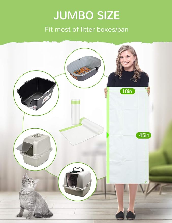 - 28 Jumbo Litter Box Liners: Each box comes with 28 kitty litter bags; jumbo size,45 x 19 inches x 2 mil, fit for most litter boxes; What's more, each bag is separate, would NOT tear at the seam when you open it like other brand