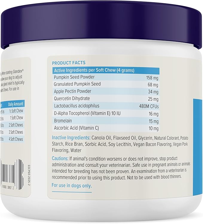 - SUPPORTS HEALTHY ANAL GLANDS: Glandex is scientifically formulated to support healthy anal glands. With key ingredients including pumpkin seed, Glandex promotes natural emptying of the anal glands & supports digestive health & seasonal allergies. NEW PACKAGING, SAME GREAT FORMULA