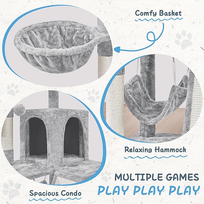 - MULTI-FUNCTIONAL CAT ACTIVITY PLAYGROUND: Featuring a multilevel design, this cat tree is a good choice for any cat to play or rest. A top perch is suitable for viewing, a basket is good for lounging, a scratching board encourages feline friends' active behavior, and a condo/hammock is good for sleeping. This multilevel cat tower provides a safe space for your cats to sleep or play when you are not home