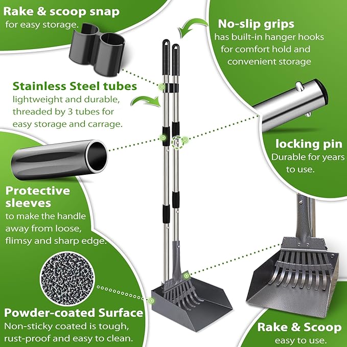 - ❤ BIGGER SHOVEL HOLDS MORE WASTE – 2 times larger shovel lets you conveniently pick up more before you trek back to the trash can. No more going back and forth to clean your whole backyard or lawn. Our large shovel holds a lot more than any other small shovels on the market! WITH FLEXIBLE RAKE, lets you pick up waste easier and faster, perfect for yard, lawn, dirt, gravel.