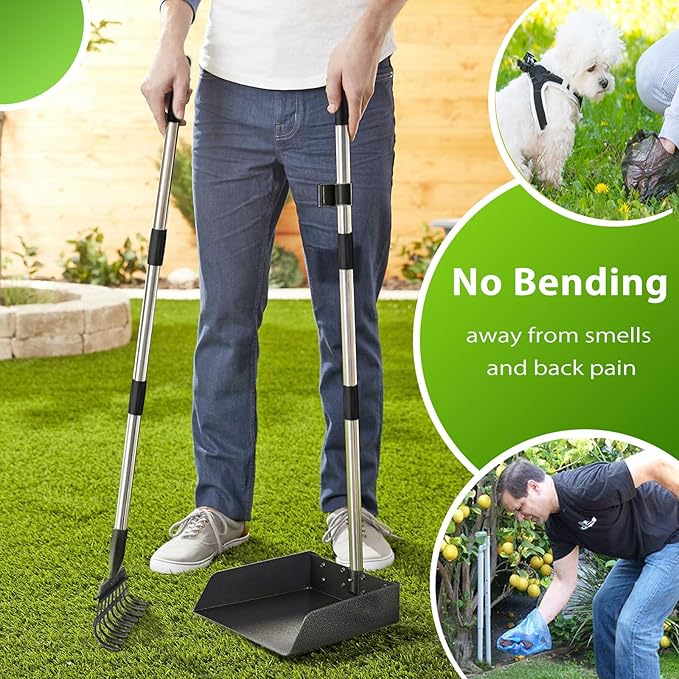 - ❤ EASY TO USE, NO MORE BENDING - Easily scoop up your dogs poop with flexible rake without ever having to stretch, kneel, or bend down. The 37.4” long, comfortable handles on the pooper scooper is the perfect length for those that want to scoop from a comfortable position. Lightweight design (Only 2 lbs) is for everyday use.
