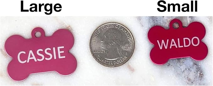 - SHAPES AND SIZES: Our custom pet identification tags are available in large bone, small bone, large paw print, large round or circle, small round or circle, and cat face or head. Tags may have slight variation in shape due to different manufacturing processes (i.e. for the heart tag, the hole to put the ring to attach to the collar my be at the top of the tag above the heart or at the top of the heart).