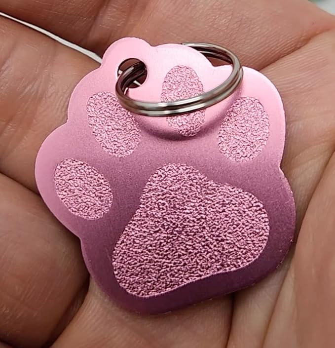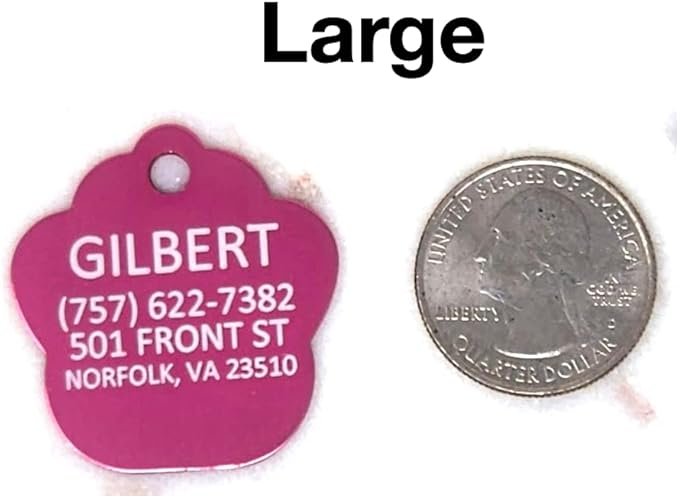 - MANY COLORS: Whether you need a large dog tag engraved for pets or a gift for pet lovers in general, we have you covered. Our personalized dog name tags and cat name tags are available in many different shapes and colors. You can choose from Black, Blue, Green, Pink, Purple, Red, Silver, Orange, and Gold/Yellow. Tags may vary in shade (i.e. a pink tag might be more light pink, hot pink, or classic pink) due to different anodization processes during manufacturing.