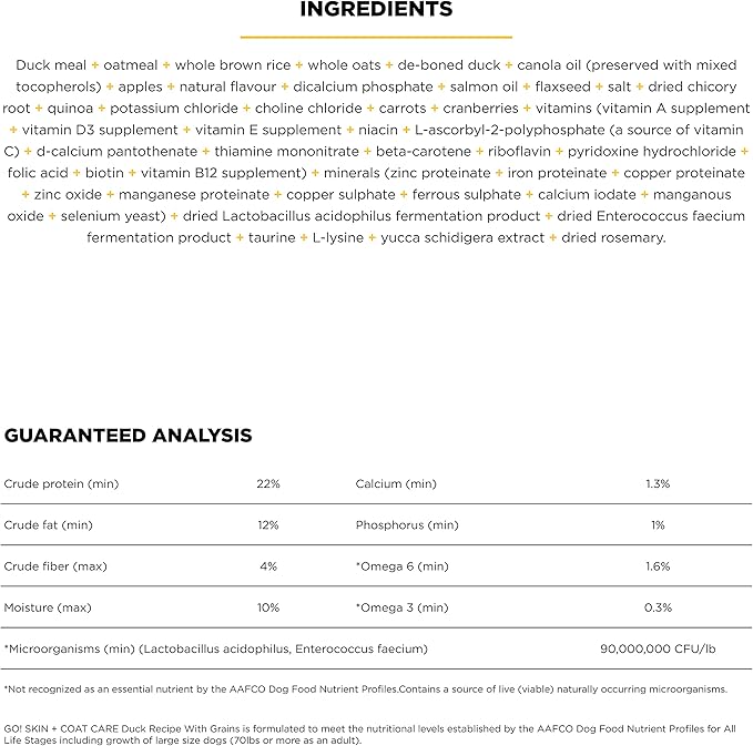 Go! Solutions Skin + Coat Care, Dry Dog Food, Duck Recipe with Grains, 3.5 lb Bag