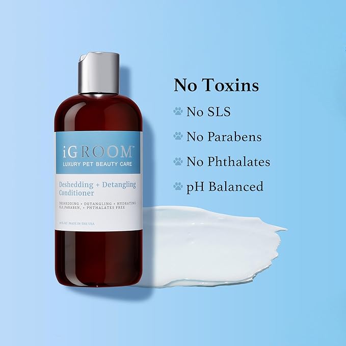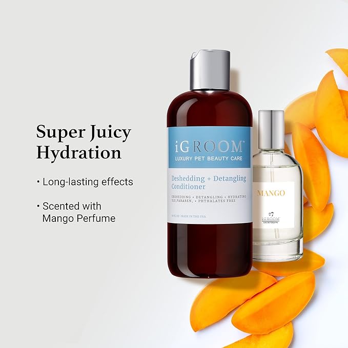 - DESHEDDING DOG CONDITIONER – use iGroom’s best-selling conditioner for maximum deshedding results. This non-greasy pet conditioner loosens tangles, shedding undercoat, and prevents new knots from appearing. Removes shedding hair when bathing, drying, and brushing. Leaves the coat looking, feeling, and smelling amazing. Scented with iGroom Mango perfume. For the best results begin with iGroom Deshedding + Detangling Shampoo.