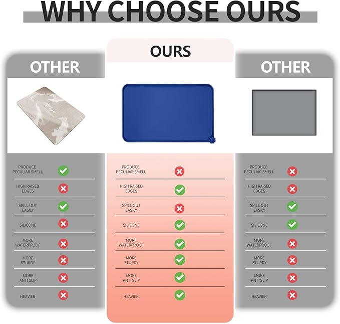 - Various sizes available: our pet mats come in 5 different sizes - 18.5" x 11.5", 22" x 14", 24" x 16", 28" x 18", and 32" x 24". Suitable for all kinds of pets, from puppies to large pets, choose the perfect size for your furry friends and avoid messy spills at mealtime
