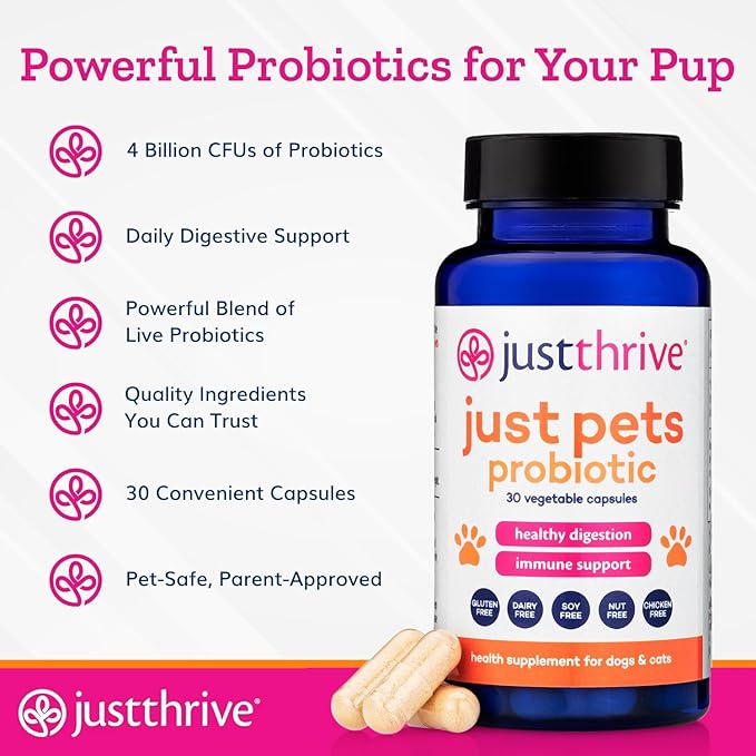 Just Thrive Just Pets Probiotic - Daily Digestive Probiotics for Dogs and Cats - 4 Billion CFUs Pet Probiotic, 30 Capsules
