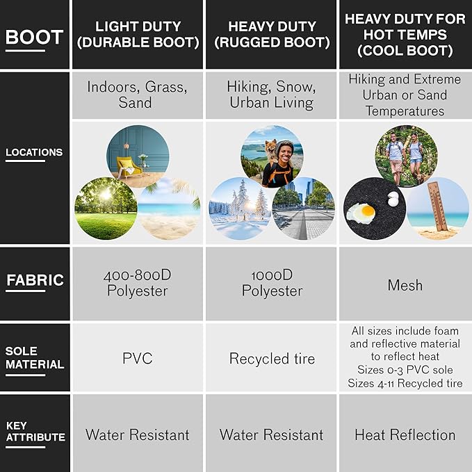 - LIGHT DUTY BOOTS ARE IDEAL FOR: Dog parks, dog pools, snow, grass runs and dog shoes to protect paws from chemicals and hot or cold temperatures. Also to keep dogs from licking natural dog paw balm, cream, or soother.