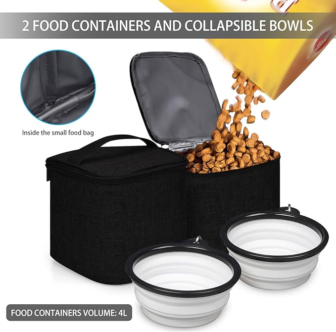 BAGLHER Pet Travel Bag, Double-Layer Pet Supplies Backpack (for All Pet Travel Supplies), Pet Travel Backpack with 2 Silicone Collapsible Bowls and 2 Food Baskets Black