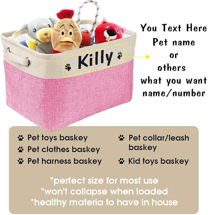 PET ARTIST Collapsible Pet Toy Storage Basket Bin - Personalized with Pet's Name, Rectangular Storage Box Chest Organizer for Toys, Coats, Clothing & Accessories, Pink