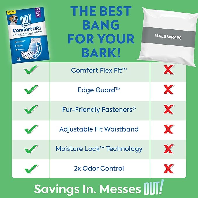 - MALE WRAPS FOR DOGS: Designed with your dog in mind, OUT! PetCare Disposable Male Wraps help you stay ahead of those pesky messes, providing support and protection for male dogs with urinary incontinence, excitable urination, male marking, and travel
