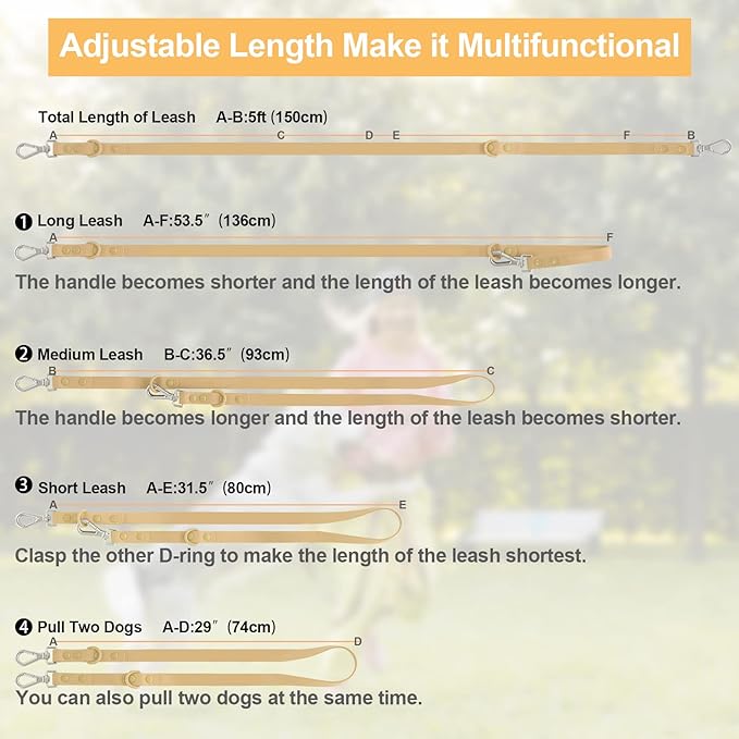 Wisedog Waterproof Dog Leash – 5ft/6ft Adjustable with 2 Hooks & Traffic Handle, Easy to Clean Double Clip Leash for Small, Medium, Large Dogs (Sand Color M)