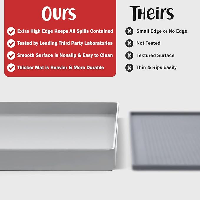 - Less Mess & Less Stress: Super high edge (0.6”) of DogBuddy Dog Food Mat keeps the spilled food and water on the mat and away from your beautiful floor. Silicone is naturally 100% waterproof, so what happens on the mat stays on the mat.