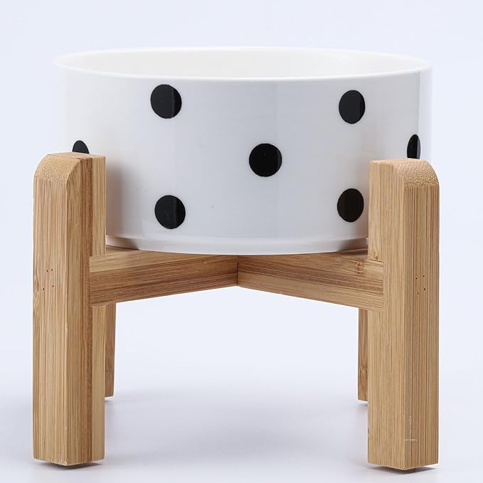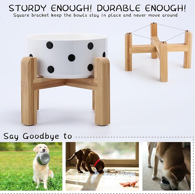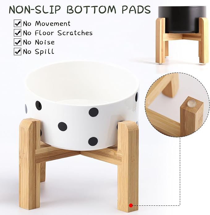 - NON SLIP WOOD STAND -You can get two different heights by flipping the bamboo stand,the elevated cat bowls are perfect for cats and small size dogs from different stages of childhood to adulthood, The wood stand on the bowls stopping ceramic cat dog bowl from sliding around, Keeps pet food and water in the bowls.