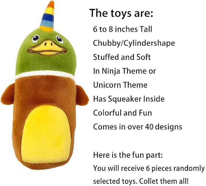 - SUPER VALUE &GREAT FUN: Includes 6 Super Cute Designs of Surprise Dog Squeaky Toys for Small, Medium and Large Breeds. There Are A Total Of More Than 40 Designs Divided Into Two Themes - Ninja Theme and Unicorn Theme - And Dozens Of Animal Character Designs.