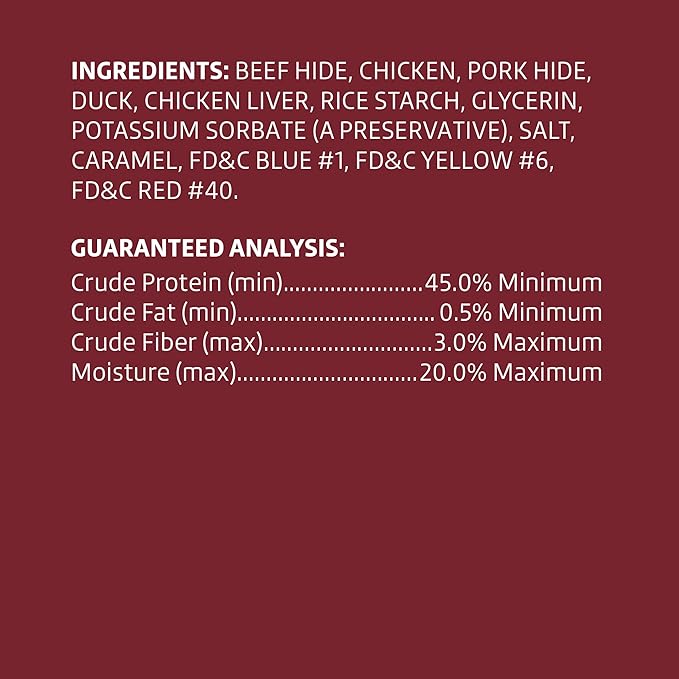 - MADE WITH REAL MEAT: Made with beef hide and pork hide wrapped in a flavor trio of real chicken, duck and chicken liver