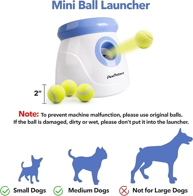 PetPrime Dog Automatic Ball Launcher Dog Interactive Fetch Toy Pet 2'' Thrower Throwing Game 3 Tennis Balls Tennis Mini Size Ball Launcher for Dogs Included Launch Distance 10-30ft