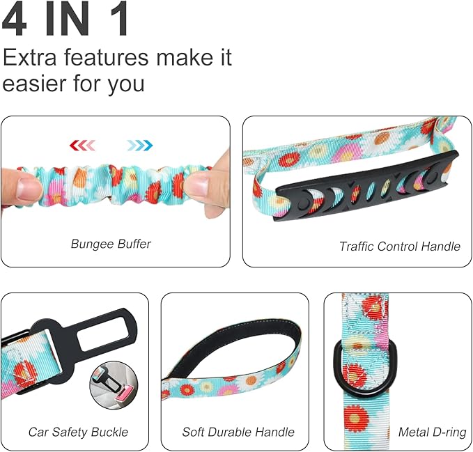 Hotsky Tactical Dog Leash Heavy Duty for Medium Large Dogs That Pull,4-6Ft Strong Bungee Shock Absorbing No Pull Dog Leash with Padded Double Handle and Car Seatbelt,Daisy