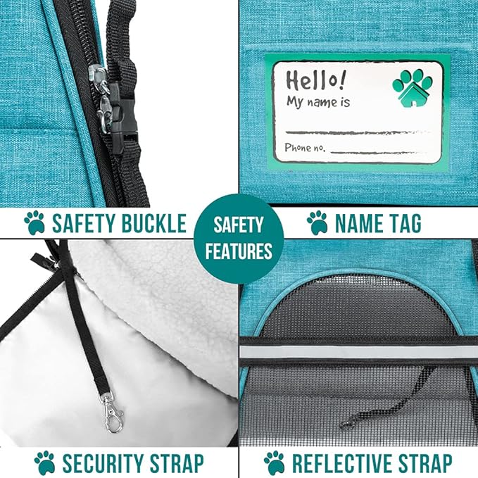 - AIRLINE APPROVED CAT CARRIER: Airline compliant and fits under most airplane seats, this tsa approved pet carrier is easy to carry on in different ways. Besides top handle strap and a removable shoulder strap, the pet travel bag is equipped with side buckles for car seat belt loops. Comes with an identification name tag, and a zipper pocket on the front to store pet stuff, treat, food, toy, or personal items, phone and cards, this soft cat taxi is the most convenient carrier for travels.