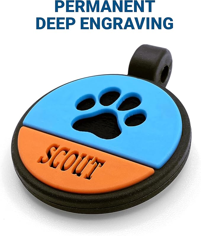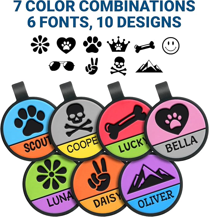 - Playfully visible with 7 vibrant color combinations that really pop! Custom design and pet information is permanently laser engraved for a crisp, attractive look.