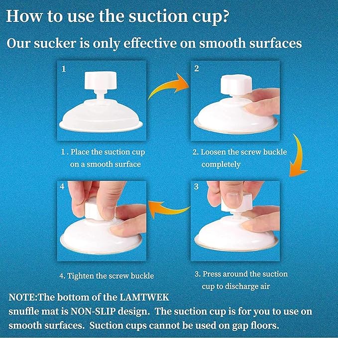 - 【2 Extra Suction Cups】By tightening the screw cap operation, pull the sucker and suck on the smooth surface.Maximize the stability of the pet training mat. Bottom non-slip cloth design that effectively holds mats and prevents the dog from moving the mat when your dog search food on the mat.