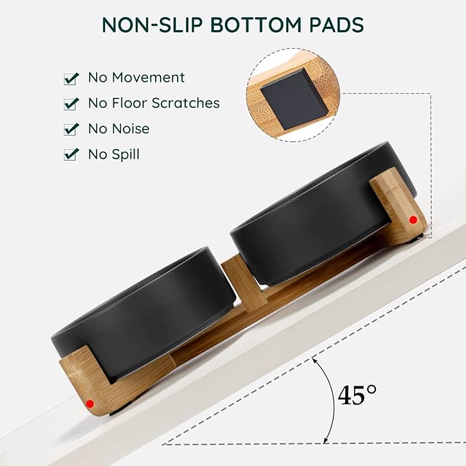 - [Double Bowl Design]:One dog bowl for food and one for water, Each ceramic cat bowl has a Unique wooden stand, raising the dishes closer to your pet for more comfortable eating