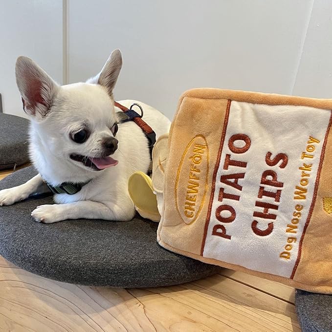- Interactive Snuffle Toy: Fill the pockets of the hide-and-seek potato chips with treats, put the chips back in the rustling packaging, and hand it to your pup. They’ll be thrilled at first sniff!