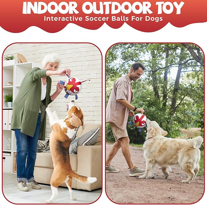 - 【🐶🐶Upgrade Interactive Dog Toy】Dog soccer ball with nylon tabs sewn evenly into the seams not only create an erratic bounce that your dogs love to chase,but also make it easier for your dogs to fetch, toss, tug and retrieve.Dog paws are printed evenly on the dog toys ball to attract your dog attention.There's a longer strap for you to hold the ball,making it a great interactive dog toy to train your dogs.