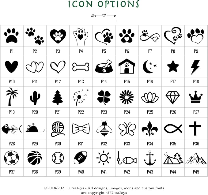 - The sample picture is for display only. It can be personalized with any text with 10 font and 45 cute icon choices, it also can be engraved both side with back engraving options,the front will be your pet name and the back engraving could be phone number, address, 'microchipped' etc.