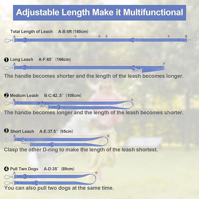 Wisedog Waterproof Dog Leash – 5ft/6ft Adjustable with 2 Hooks & Traffic Handle, Easy to Clean Double Clip Leash for Small, Medium, Large Dogs (Blue,L)