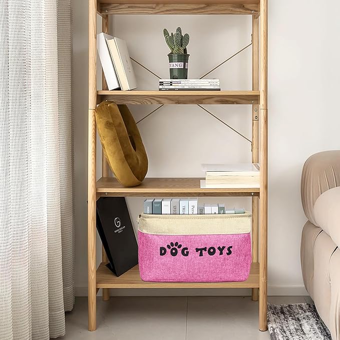 PET ARTIST Dog Toy Basket, Collapsible Dog Toy Bin Box with Comfortable Handles, Large Pet Toy Storage Organizer for Accessories, Toys, Coat & Clothing, Blanket & Leash, Pink, 15"x11"x9"