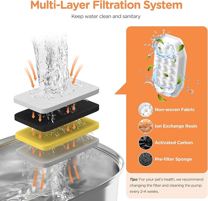 - 🐾【Quadruple Filtration System】Cat fountains is equipped with an activated carbon filter, which consists of cotton layer, activated carbon, and ion exchange resin, forming a triple filtration system. It can remove odor and soften water. Meanwhile, the filter sponge captures pet hair, dirt, and food particles, providing your pet with pure and healthy water.