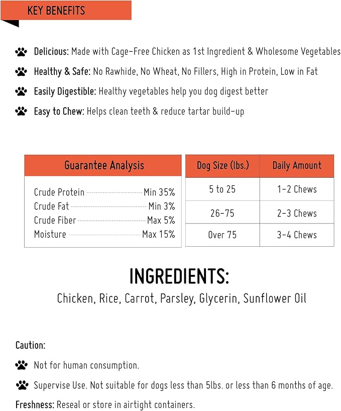 - Super Delicious: LuvChew dog chew sticks are made with100% natural cage-free chicken jerky fillets as the 1st ingredient and healthy vegetables. Made with only 6 simple ingredients.