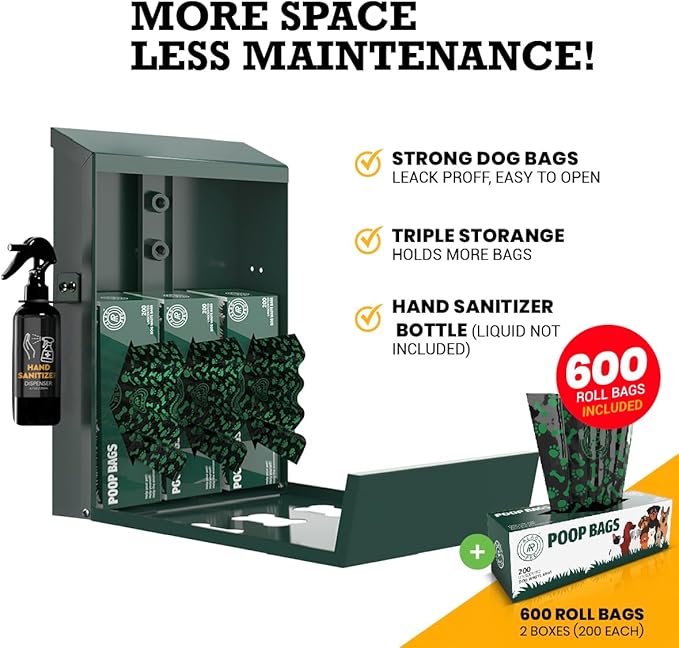 - ✅ Professional Dog Station Includes: Pet station ( doggie waste bag dispenser, bin garbage with lid and dog house shaped sign ) + 600 roll bags + 50 large can liner refill + free 75 pets poop bags with dispenser for leash. Everything included, get it now!